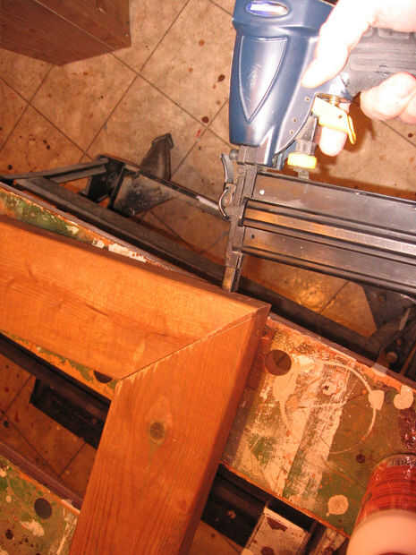 Una vez que todas las esquinas del marco han sido pegadas y clavados. Alinee el marco montado para que sea cuadrado y sujete el marco en su lugar. Si es necesario, sujete las esquinas para asegurarse de que las uniones de esquina son tan apretadas como sea posible.
