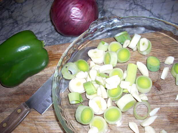 Picar las verduras, mientras que la olla en remojo. Usted puede usar lo que quieras para esto, tubérculos, mezclados con cebollas siempre son una buena base. Esta vez usé puerros, pimientos, ajo y cebollas rojas.