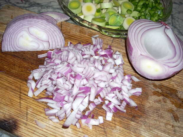Todo desmenuzar y reservar. Para evitar llorar al picar cebolla personas sugieren aspirar en un pedazo de pan blanco, de corte bajo agua fría, respirar por la nariz... ninguno de estos trabajos sin embargo, debido a que es un gas que está en el aire entre en contacto con los ojos, no la fina capa de jugo de cebolla en la boca o la nariz. Trate de usar una máscara de gas, que pueden adquirirse en tiendas de suministros de ejército más.