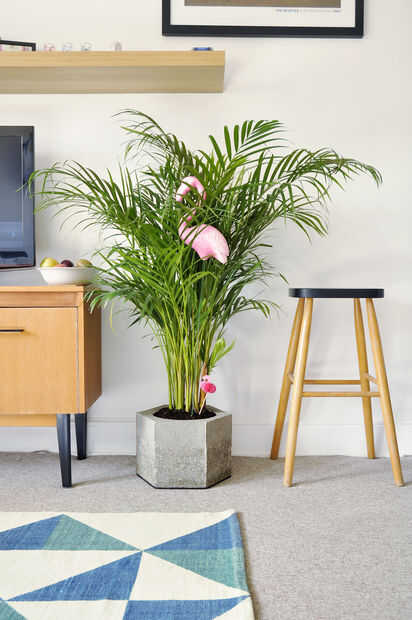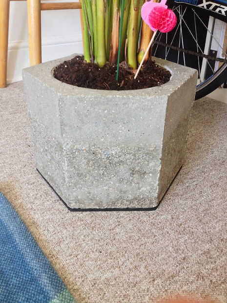 Aquí está el monstruo terminado. Aunque las dos capas de concreto se ven un poco extrañas, decido que no se ven tan mal. Tal vez, si hago otra maceta, podré aprovechar este efecto visual. Al fin y al cabo, diría el proyecto salió bien, especialmente dado fue mi primer proyecto con concreto. Pesa 18,5 kg grandes, así que me imagino podría estar afuera pecado nadie la intentara robar