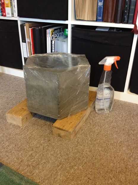 Pulvericé la maceta con montones de agua y la envolví en film de plástico para se endureciera. El endurecimiento puede durar hasta una semana, pero las instrucciones en la bolsa no contaban con esta información, así después de una noche, le quité el film de plástico para seguir trabajándola.
