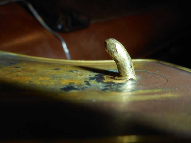 Así que de nuevo una tarea relativamente fácil que no requiere mucha delicadeza o habilidad. Tomar el clavo y poner en las garras de la mordaza en la cabeza, luego con los alicates de doblar en forma de gancho. Luego cortar a la longitud con el martillo y el cincel. O una pinzas final funciona mejor y más fácil, pero estaba a poco ambicioso ir del garaje y. Ahora que la uña se corta a la longitud de la curva el gancho en una mejor forma si es necesario. basta con mirar a otra hebilla si usted tiene uno y se va. Os pongo una foto de una hebilla de bronce bueno que tengo para tener una idea de la forma aproximada de la punta. Al final usted notará probablemente que mi diente nuevo no se parece en absoluto la forma de que en mi otra hebilla, pero hace el truco.