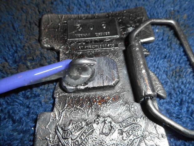 Así que ahora toma el pincel y rellenar el agujero con resina epóxica. Luego Unte el clavo en el epoxi y meter en el agujero de la hebilla. Luego use el cepillo para untar un montículo alrededor de la base de la uña. Para que haya una base sólida cuando se seca el epoxi. Este montón es probablemente innecesario, pero no duele y le da un gran apoyo.