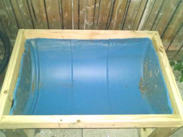 Cortar el barril de lluvia en la mitad así que usé la costura como una guía. Las dos aberturas en la parte superior se convirtieron atravesadas. Corté el labio de la parte superior para ayudar a que el barril al ras con el marco. Utilice los tornillos de la cubierta al aire libre como son resistente a la intemperie. Tornillos drywall son frágiles y se oxidarán aparte.