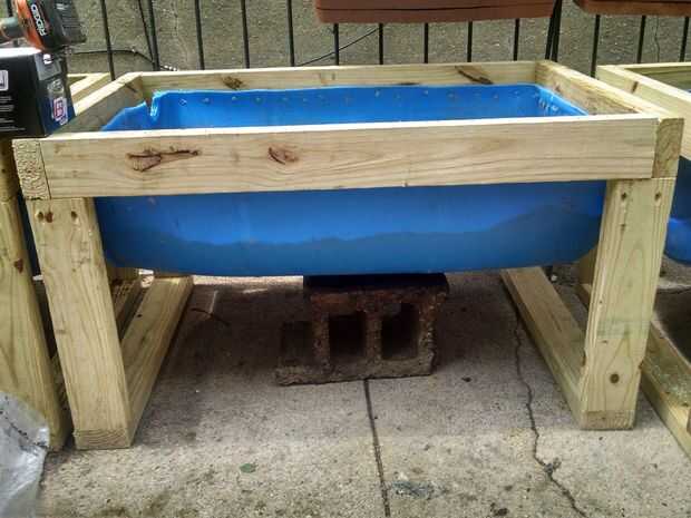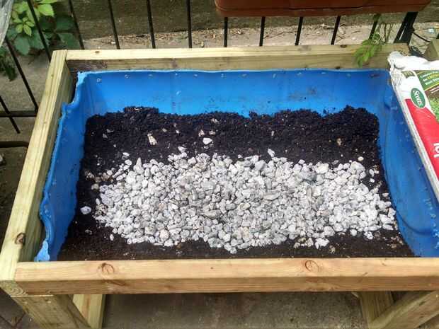 Después del montaje para el marco, añadir los agujeros para el drenaje. Usé una broca pequeña y había hecho 10 agujeros en dos filas en la parte inferior del cañón. Añadir grava y suciedad. Saltos requieren mucha agua, pero también un montón de drenaje.