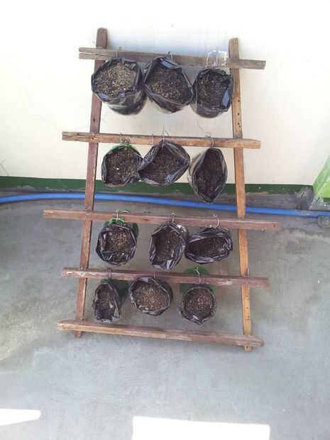 después de hecho su base ahora usted puede atar con alambre la botella de plástico cortada añadir bolsa de plástico negra y agregar suelo.