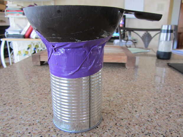 Después de haber vaciado la lata, cortar las tapas de la parte superior y parte inferior y limpiar, todo lo que necesitas hacer es cinta adhesiva en el embudo de conserva.