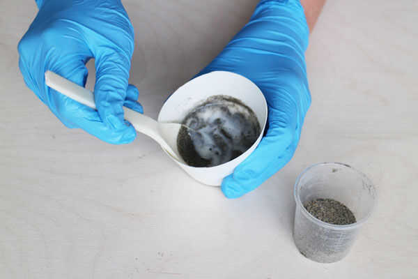 Para el material de espuma arena he usado espuma flexible de poliuretano de Douglas & Sturgess. Para crear la espuma para la primera capa usé 0,10 oz de la parte A, 0,30 oz de la parte B y 1,30 oz de arena. Mezclar durante al menos 30 segundos y añadir pequeñas cantidades de arena en el medio. Mezclado en una taza más pequeña para facilitar verter la espuma en la taza más grande engrasada. La espuma es bastante espeso y pegajoso después de mezclar, por lo que necesitaba un poco de ayuda de dos cucharas para obtener todo el material en la taza más grande.