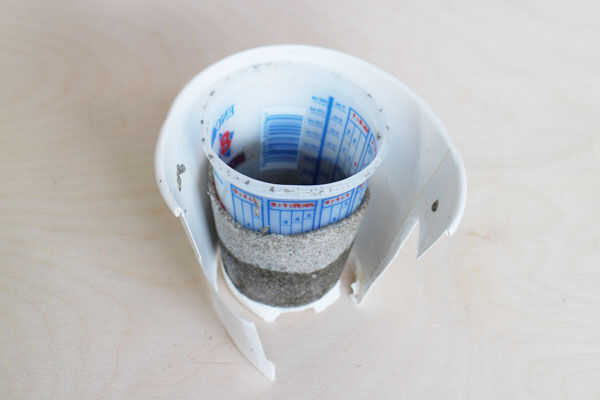 Frotis de la espuma más ligera arena encima de la primera capa alrededor de los bordes con una cuchara o palillo de mezcla. Ahora presione de nuevo la Copa más pequeña en la taza más grande, esperar hasta la segunda capa esté seca y tire la Copa más pequeña de la espuma.