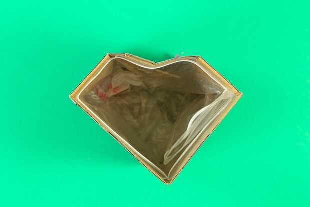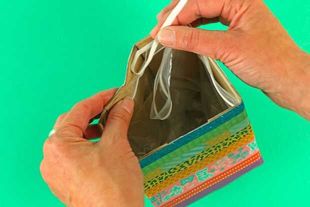 Empuje el bolso del alimento dentro del pote. Hemos conseguido el borde de la bolsa con cinta de doble cara adhesiva para que sea más ordenado.