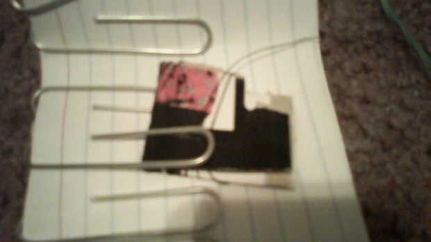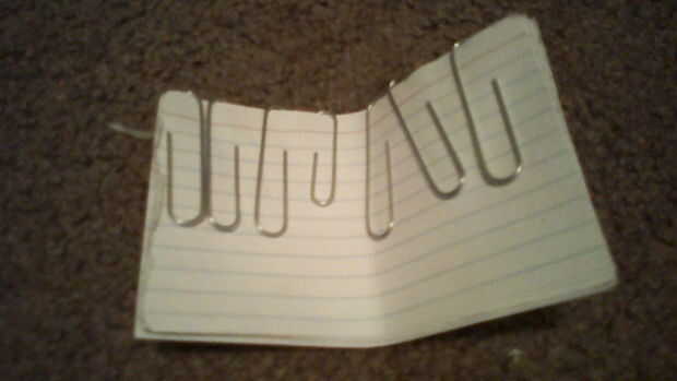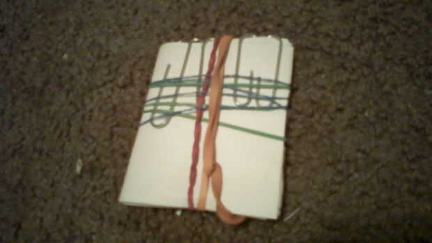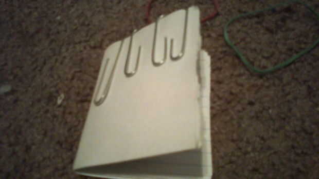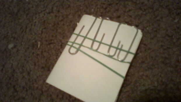 empecé doblando mis fichas en mitad, luego apliqué mis clips todo el camino a través de las tarjetas. Yo entonces envuelto mi hilo alrededor de un pedazo de cartón para evitar ser enredado. Después esta terminando dobla la tarjeta por la mitad, luego envolver mis gomas horizontalmente, verticalmente, horizontalmente y verticalmente otra vez. Usted puede agregar fácilmente más clips, tarjetas, bandas de caucho o hilo. Siempre mantengo mi navaja suiza en mi, cuando estoy fuera de la escuela, por lo que mucho he cubierto con sólo las cosas en mis bolsillos.