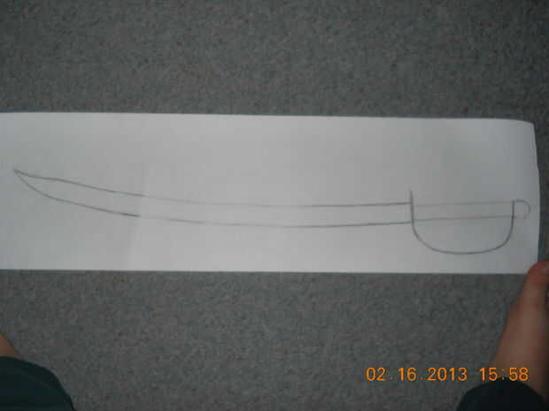 tengo suerte de tener este rollo interminable de papel así que decidí esbozar mi diseño en el papel dice. Recuerde el ancho de la hoja está determinada por el la circunferencia de la tubería (sólo puede ser la mitad de la circunferencia) más toda la longitud de la espada debe ser alrededor 28"(71cm) para la espada que de rigor histórico también hace que la cuchilla balanceada.