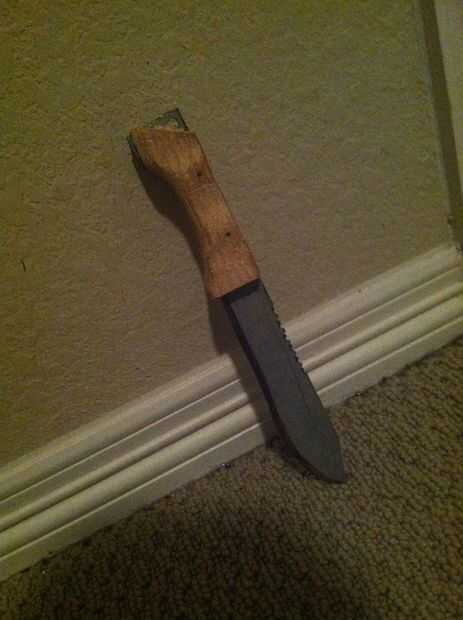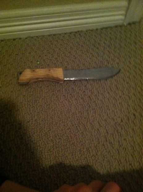esto es un cuchillo machete/Bowie hice después de ver algunos que tubo videos caseros machetes la manija se hace de una pieza de 2 x 4 el acero es de Home Depot para hacerlo, en primer lugar, trazado el diseño sobre el acero entonces, tomé mi sierra y comenzó a cortar la espiga. Después de eso tomé mi archivo y comenzó a presentar a un borde afilado. A continuación, saqué un 2 x 4 y corte un precio que es la misma longitud que el la manija y dividirlo por la mitad. Después de eso, taladró dos agujeros en el acero y clavaron las dos mitades de madera juntos. Por último, utilicé una madera a archivo la madera hacia abajo para facilitar un cómoda asa. Aprendí una lección importante mientras que hace esta mano herramientas toman siempre usar pero funciona realmente bien. Estoy pensando en tratamiento después