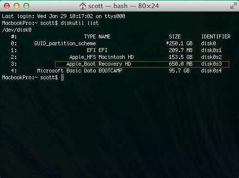 Asegúrese de tener una partición de recuperación en su Mac. Abra la aplicación Terminal en aplicaciones > Utilidades > Terminal. En tipo de Terminal el "diskutil list" de comando y presione entran. Si aparece una entrada contiene "Recovery HD" entonces tienes una partición de recuperación.
