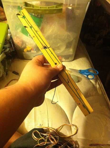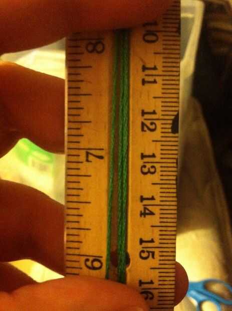 Medir la cadena suelo ir 5 pies Envuelva la cuerda alrededor de la regla 5 veces como en la foto. Hacer esto con 3 a 6 hilos de cadena. Yo uso 6 generalmente incluso tho tiende a tomar más tiempo.