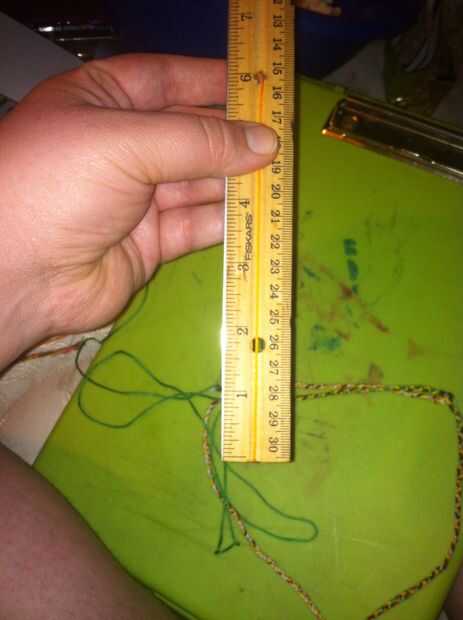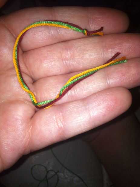 Recortar el exceso de cordel de los filamentos. Poner el talón en ambos filamentos. Si utiliza más de un color y medida 3 colores de cadena de 6 pulgadas. Si utiliza sólo un color entonces sólo tiene que utilizar 3 en 6 hebras para esto. Anudar un extremo de 3 hilos.