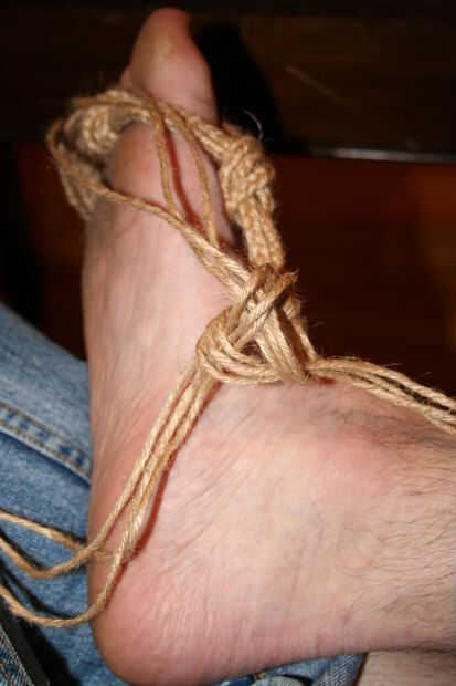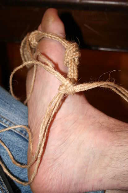 Encontrar que trabajo con mi pie seguía siendo la forma más fácil de ir sobre esto, até los tres paquetes juntos con un nudo justo debajo de donde el inicio de trenzas y otro nudo unos 3cm más abajo. Luego se deslizó dos nudos sobre mi dedo del pie con el final inacabado frente a me y fue a trabajar.