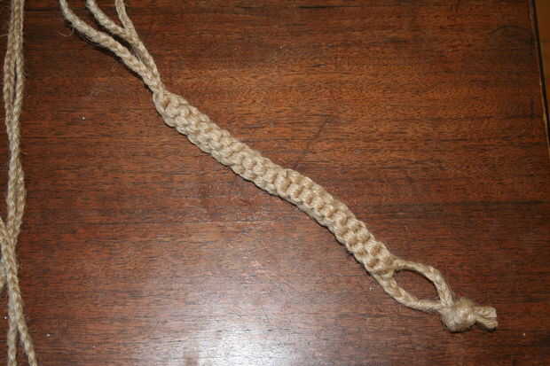 Yo seguí en añadiendo más capas hasta que tuve unos 10cm de material a la izquierda, momento en el que sólo me divididos en dos grupos, cada uno trenzado (la distribución no era aún, pero es un tramo muy corto y no muy sensible) y los dos atados juntos después de unos 4cm de trenza fue creado. Este nudo final debe ser muy apretado, y también he añadido algunos pegamento blanco para que agregar una resistencia extra. Este nudo se mantiene la planta colgando del gancho, así que asegúrese de que está bien hecho.