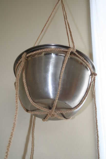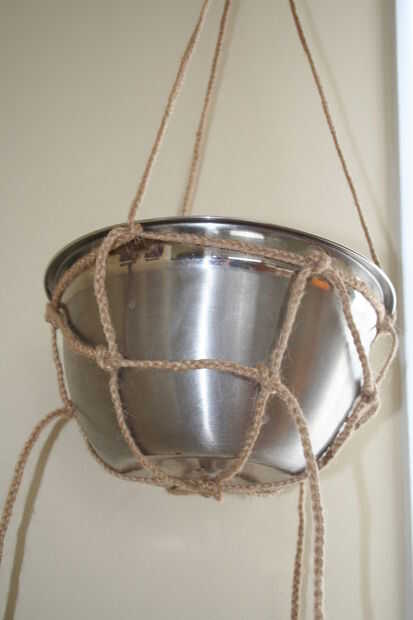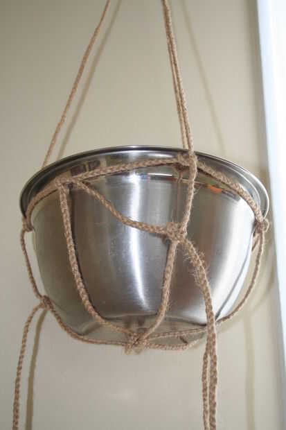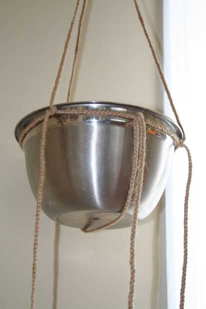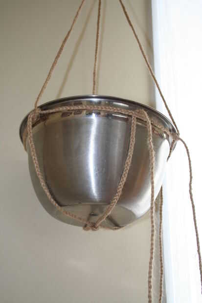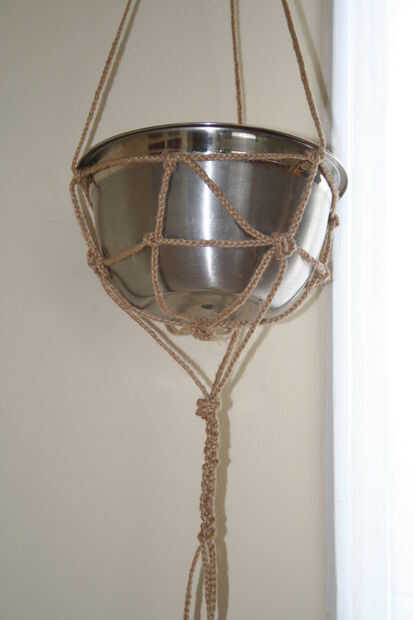 En este punto el bote muy bien fue envuelto y sostenido en el lugar, así que las longitudes restantes fueron agrupadas sólo hasta unos 5cm debajo de la olla, atadas juntos y luego trenzadas libremente. La última cosa que quisiera añadir a esto tal vez es una piedra interesante el tamaño del puño de un niño que se cuelga en el tramo inferior y ayuda el hilo un poco.