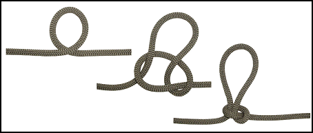 1. Comience con cuatro cuerdas.2. Pase el cordón derecho sobre y a la izquierda de los cables de dos anclaje.3. Coloque el cordón izquierdo sobre el cordón derecho.4. Pase la cuerda izquierda debajo de las anclas y a través del bucle formado por el c