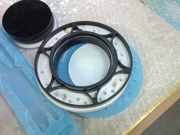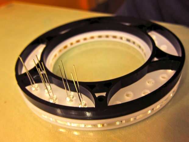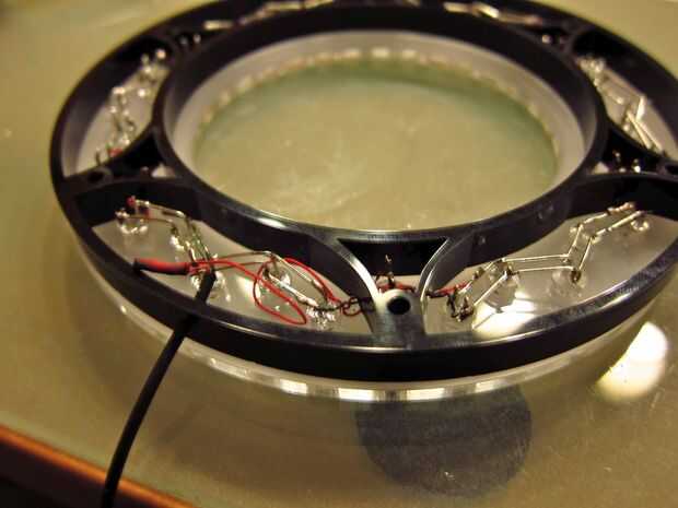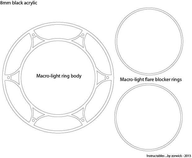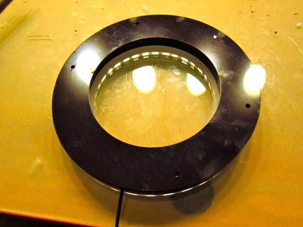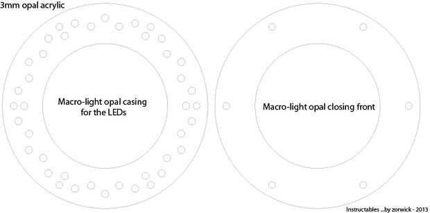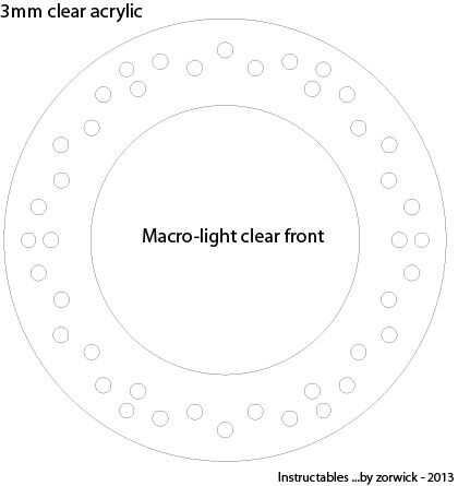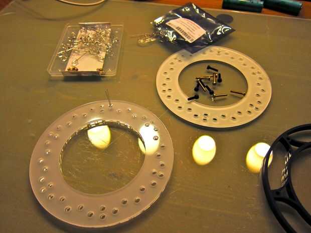 Se pegan los elementos delanteros. Corté dos ópalo y un anillo claro. El anillo superior es de acrílico opal para ablandar las luces y tiene sólo los 6 orificios para tornillo insertos. El anillo medio es acrílico claro y tiene todos los agujeros LED y tornillo, igual que la última capa de ópalo.