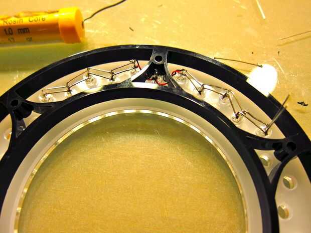 He pegado el 6 Tornillo insertos en los elementos frente a todos los LEDs uno a uno y les juntos divididos en dos grupos, izquierdos y derecho soldado. A veces es bueno tener la luz proveniente de un lado es por eso que les separaba. La unidad de potencia tiene dos interruptores para encender para arriba.