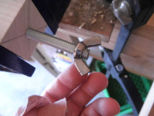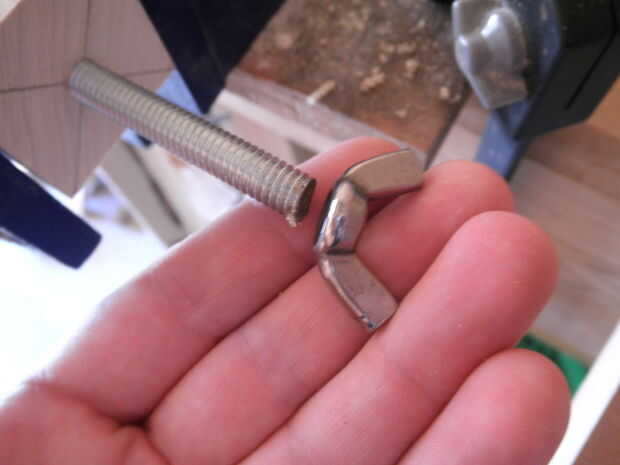 Sosteniendo la barra cruzada en un vicio utilice mi sierra para Sierre el perno y cortó la cabeza del perno. Una vez hecho esto obtengo mi palomilla y empezar tratando de hilo sobre el nuevo corte apagado área perno principal. Esto puede tomar un poco de grasa de codo en algunos lugares como la sierra puede han enturbiado las roscas pero no tengo mucho apuro y pronto mi palomilla roscada sin esfuerzo dentro y fuera.