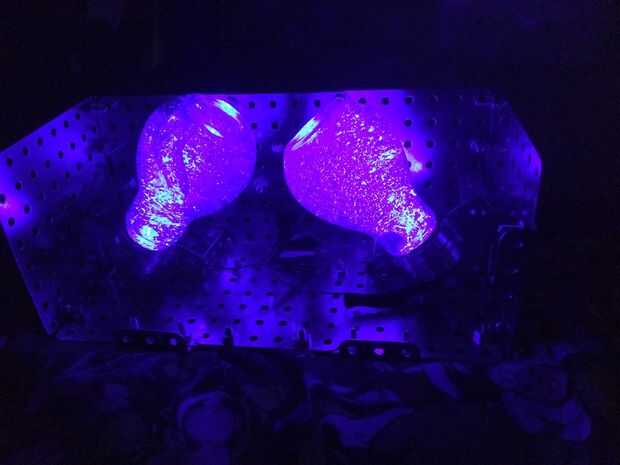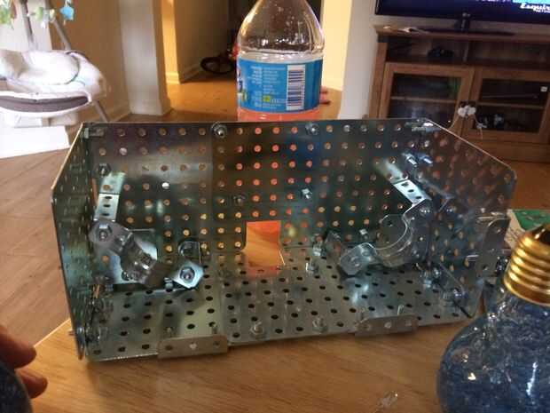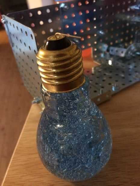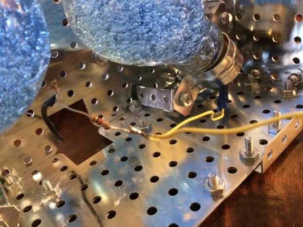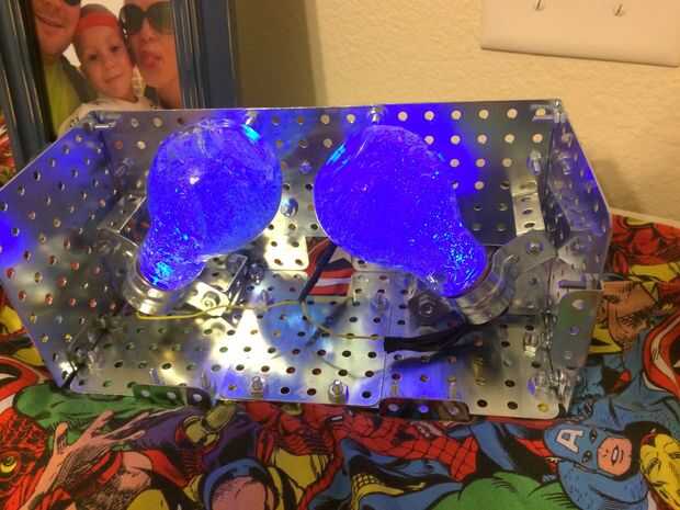 Así que durante una mudanza el acrílico se rompió en la parte frontal de la luz. Así que renovarán con placas de acero de la manía. Los pasos todos siguen igual, excepto el montaje. Es muy versátil, que se puede construir todo lo que te gusta de la forma y deslice en los bulbos. No he tenido una resistencia con el nuevo diseño porque puse un cable nuevo que sólo tenía .35mA. Fue suficiente encender ambos LEDs, por lo que no hay resistencias necesitan. También de tierra el poder de la estructura sí mismo, y los hilos metálicos de la lámpara completa el circuito.