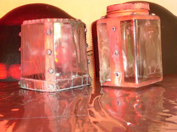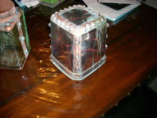 Paso a paso, giré recipientes de basura plástica, pegamento caliente y pintura en envases de metal y vidrio que han sido testigos (y contienen) abominaciones dementes! OK, no mucho de un estiramiento allí, pero la ilusión de metal y vidrio que salió bastante bien, creo,