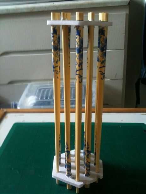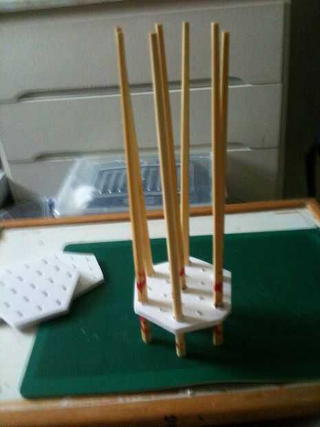 Después de las seis esquinas y el centro añadí la otra plataforma y empuja suavemente a través de los otros. Deberás acabar con los diecinueve palillos sostenidos firmemente por las plataformas de la Junta en cada extremo. Usted puede tener en cuenta en la foto que hay claras lagunas a través del cual usted puede ver y pegar próximo conjunto de palillos