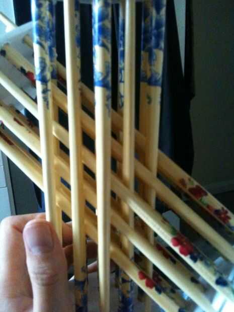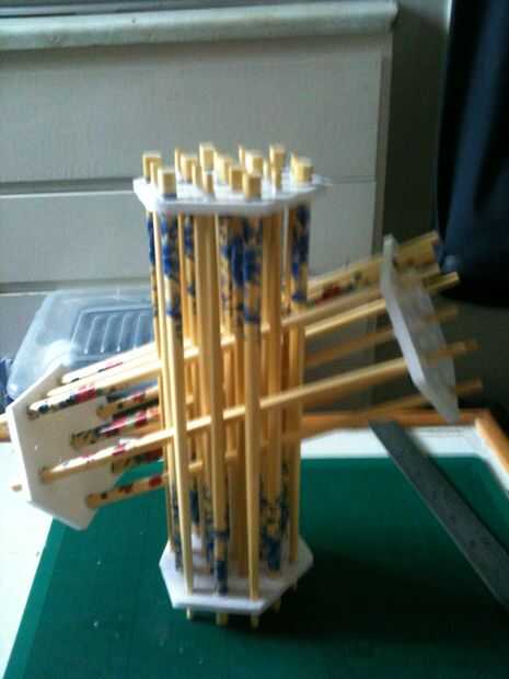 Con un aparejo nuevo - empuje a través de las seis esquinas y el palillo de centro.  Ahora necesita los extremos abiertos de la ranura a través de las brechas abiertas que se podía ver en la imagen.  Añadir la otra plataforma en el otro extremo - y rellene todos los espacios de diecinueve.   Queda claro que los agujeros cada uno pasa a través de.