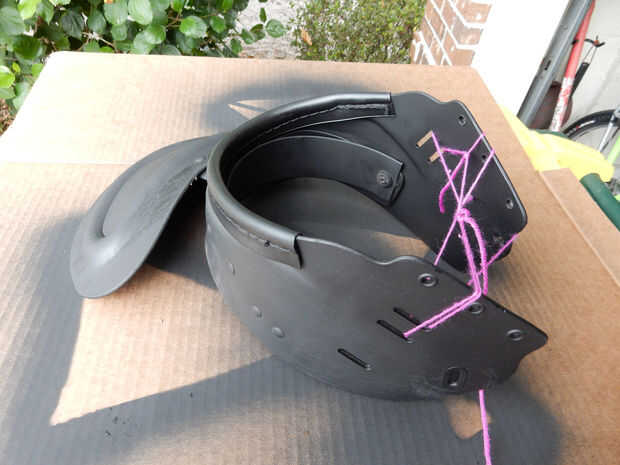 A continuación, pintura de aerosol la hombrera. Una vez que haya secado la pintura, si es necesario, tomar el hilo y ate la parte delantera y trasera de las hombreras "juntos". Vea la foto de lo que quiero decir. Esto tira de la parte delantera y trasera más cerca juntos, trayendo más ajustado al cuerpo. Coincidir para el tamaño de su hombro.