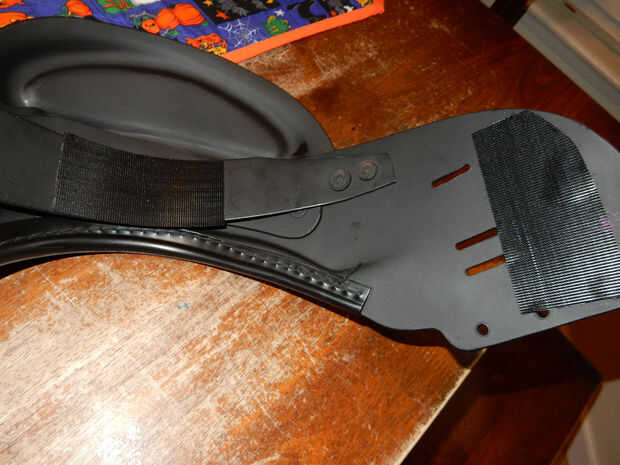 También, la parte inferior del collar querrá flop alrededor libremente como se sienta en la parte exterior de la almohadilla. Para evitar esto, coloque un pedazo pequeño de velcro en la punta de la aleta del cuello y pegarlo en el plato, manteniendo la aleta del cuello en su lugar.