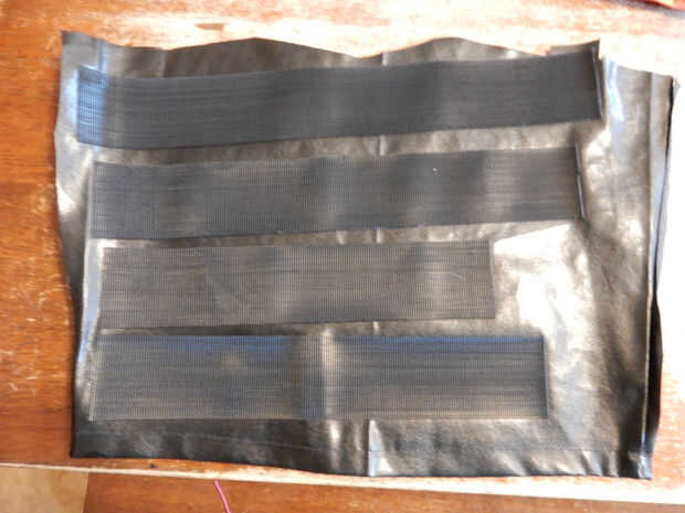 Ahora, como las bandas anteriores, las correas frontales deben ser unas pocas pulgadas más largo que la longitud de pierna, respectiva a cada segmento de la pierna recibe una correa. Una vez que las primeras cuatro cintas han sido hechas y unida a los soportes, y las cuatro correas frontal tamaño y pegan al corte de chatarra manga salidas, estás listo para armar el traje.