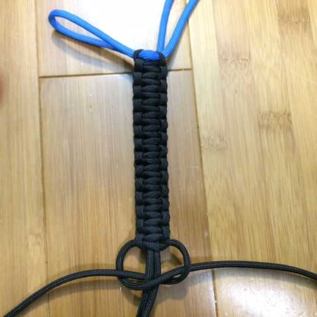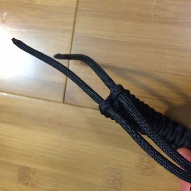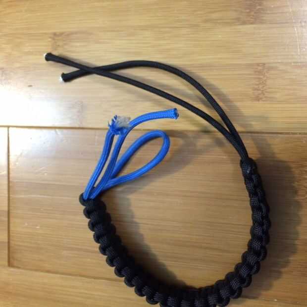 Mantener trenzado hasta la parte trenzada es tiempo suficiente para ir alrededor de su muñeca. Cortan el lazo, tire el pedazo de paracord hacia fuera y los 2 extremos de paracord en los 2 agujeros.