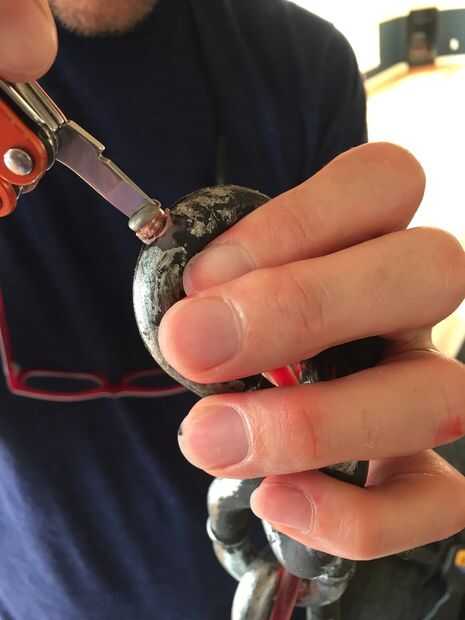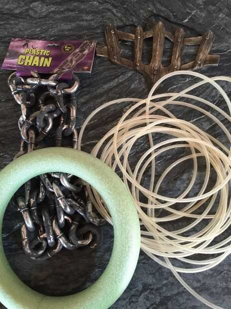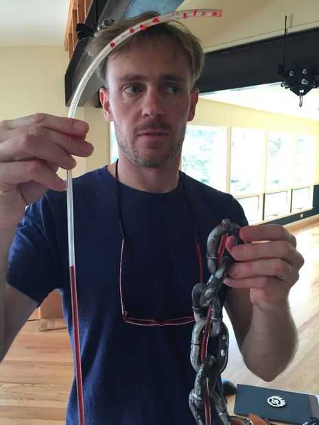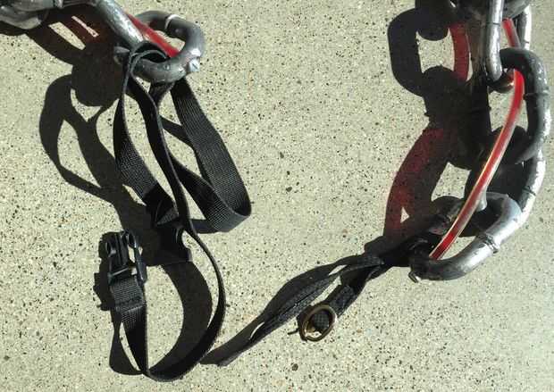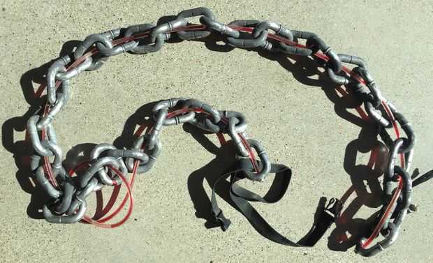 Había roscado de la tubería a través de la cadena de plástico, lleno de agua teñida de rojo con colorante alimenticio y sellar los extremos con un perno y epoxy. Para fijar la cadena a mi cuello, cosí sobre un pedazo negro de cinta y una hebilla. Para conectar al otro extremo muñeca del muchacho de mi guerra, cosí con una correa negra de un zapato viejo.