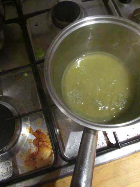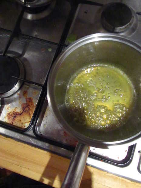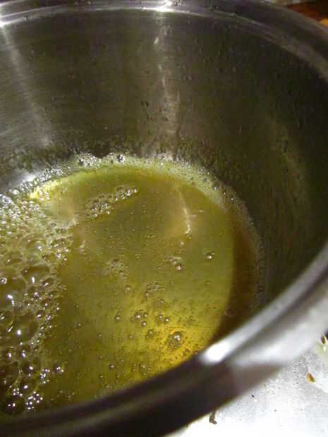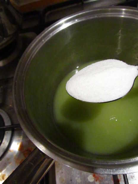 Calienta la mezcla, manteniendo un ojo sobre él hasta que el azúcar se disuelva y el líquido se convierte en claro. Seguir a burbujear durante otros pocos minutos para dejar un color poco desarrollar y luego apagar y dejar el jarabe se enfríe.
