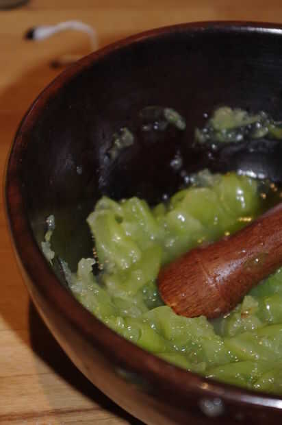 Para hacer el jarabe, primero aplastar algunas uvas en un tazón con un mortero o un perno de balanceo.