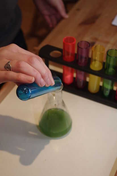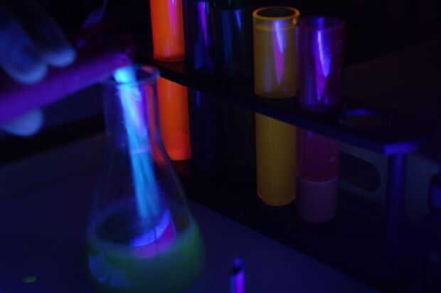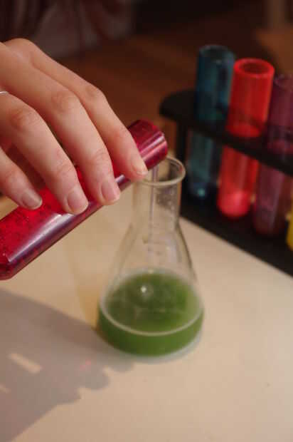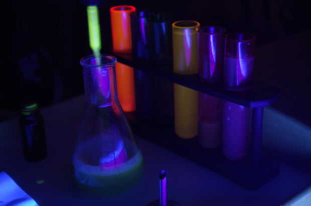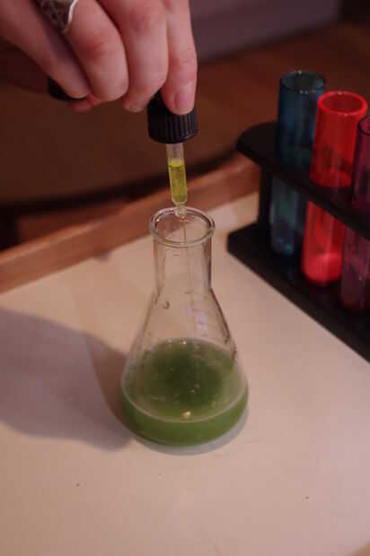 6. utilizando la pipeta o gotero, agregar 5 pipetas de precisión de la solución de B12 en el matraz. Esto comenzará lo extraño brillo, resultado de la vitamina fluorescente.