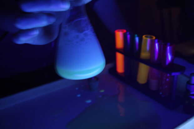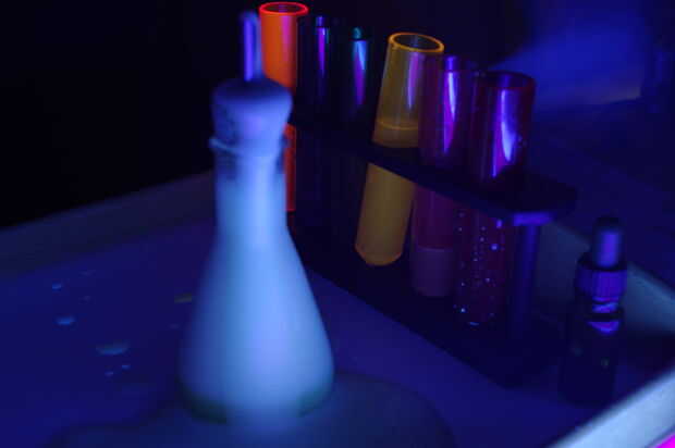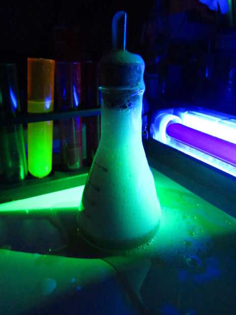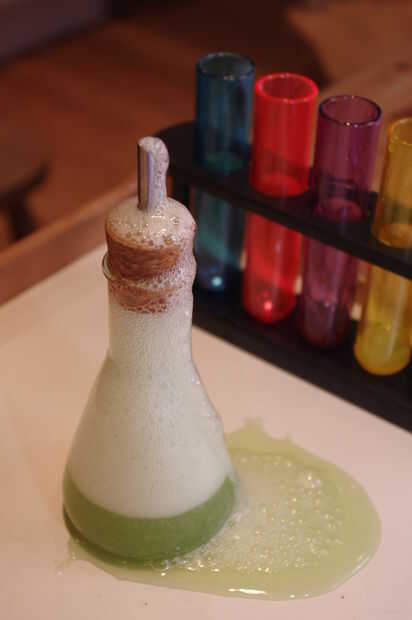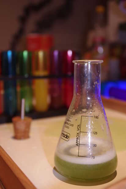 Como se puede ver en el siguiente video, la reacción entre el bicarbonato de sodio (la base) y el ácido en el jugo de limón y ácido cítrico crea una dramática hirviendo y efecto burbujeante, que envía el cóctel espuma de su frasco. Combinado con el extraño brillo de la B12 y la quinina, es una bebida de sueño de científicos locos. En la última prueba, la dulzura del melón y uva fijó contra el amargo citrus y fizz de la tónica que sea una experiencia más agradable para llevar a cabo.