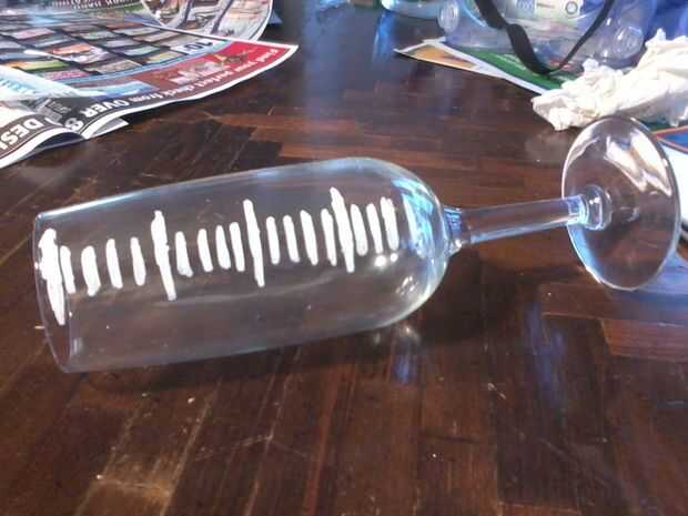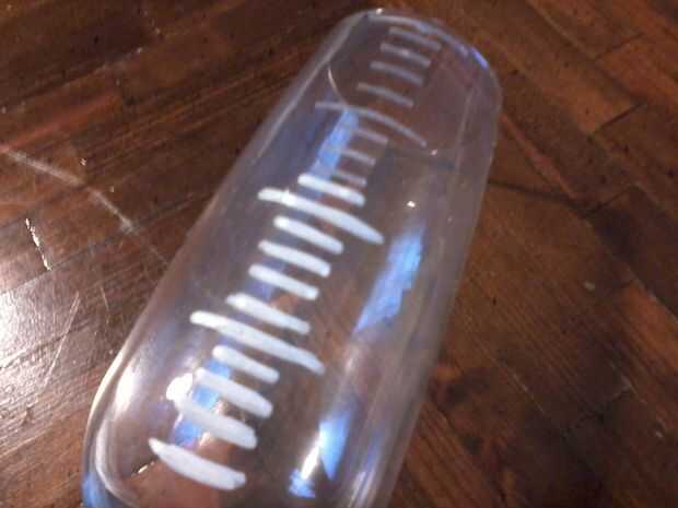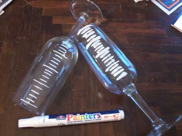 Utilizando un lápiz de pintura blanca (yo usé marca de Elmer), cuidadosamente Marque sobre las líneas grabadas de su cristal. Está bien si consigues desordenado.