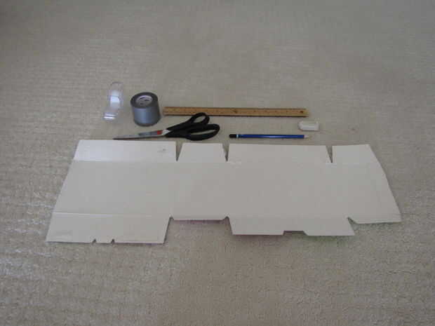 Entonces, encontramos lo siguiente: cartón, cinta adhesiva, cinta transparente, sacador de agujero, regla (tal vez), tijeras, lápiz (tal vez), rubber/eraser(maybe) y doble cara palo de cinta o pegamento.