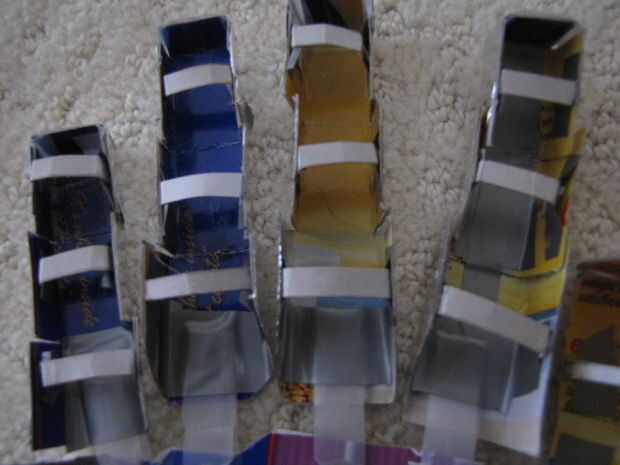 a continuación, cortar finas sobre largo (1 in) estos le extienden los dedos y mantenerlos en forma. Se necesita 14 de estos. Si el dedo es de 1 cm de ancho mide 1 cm en el centro de la tira de cartón.