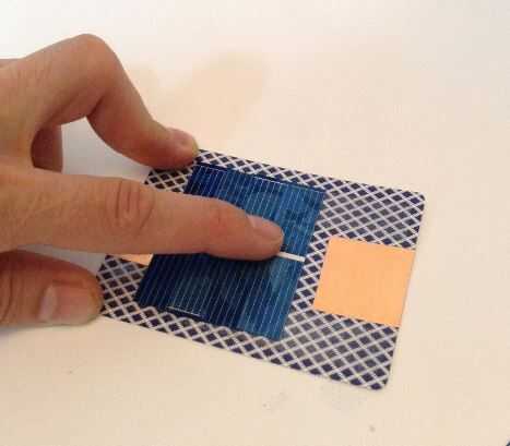 Para su primer solette, asegúrese de que tiene parte de la barra blanca por debajo la solette en contacto con la cinta de cobre. Usé una barra completa solette en este ejemplo. Superponer a la barra bajo la solette con coppertape por al menos 2mm para asegurar una buena conexión estable, y las dos tiras de cinta de doble cara que ha establecido lo sostenga en su lugar. Azul hacia arriba hacia el sol.