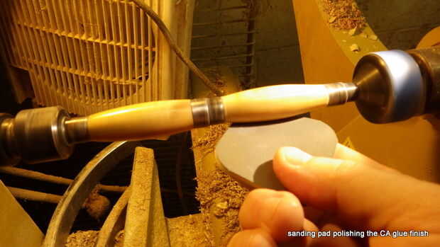 Porque la madera es suave y capas empiezo con tres o cuatro capas de fina cola de CA. Inicialmente verter sobre la pluma y deje que se absorba con el torno apagado. Pone demasiado en como se forma un goteo en la parte baja de la pluma. Una vez que la primera aplicación de pegamento fue absorbida por la madera y seca me potencia el torno y correr a 400 rpm. Corte un cuadrado pequeño de toalla de papel y doblé varias veces haciendo un rectángulo 1 "x 3". Goteo como pequeña cantidad de pegamento delgada de CA en la toalla de papel y aplique el pegamento en los espacios en blanco de la pluma frotando la toalla de papel hacia adelante y hacia atrás como se convierte la madera. Una vez que han cubierto la pluma Retire el aplicador de la pluma y ya sea esperar a que el pegamento se seque, o acelerador de spray sobre el CA revestido madera para curar rápidamente el pegamento. Repetir este proceso tres o cuatro veces con un nuevo pedazo de toalla de papel para cada capa adicional de CA cola. Luego cambio a pegamento de viscosidad media CA. Utilizando el mismo proceso para aplicar 4-5 capas de media cola de CA a la pluma, otra vez usando una toalla de papel nueva para cada aplicación. No intente aplicar demasiado pegamento medio en la pluma en un momento como que sólo crean crestas, basta con un par de gotas 2-3 por aplicación.