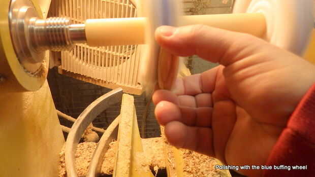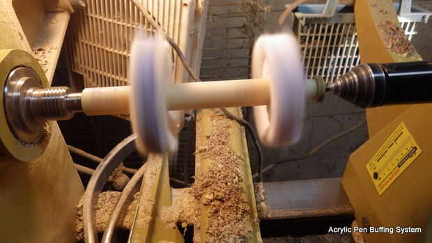 El pulimentar es mi paso acabado final para obtener el acabado final. Utilizar un sistema de pulido que es de muy alta calidad. Está instalado en una chimenea que se acopla a la headsock de mi torno http://www.arizonasilhouette.com/product/BG012.htm... (Ver la tercera foto de arriba). Con la espuma corriendo, carga la primera tecla con el compuesto pulidor azul. Puse el pen en blanco contra la almohadilla y lo asegurando que toda la pieza se pule gira. Sujete firmemente las piezas y repita para las mitades superior e inferior de la pluma. Una vez que lo completa, luego buff les en la rueda final para mejorar la profundidad una vez más! (Ver el cuadro adelante arriba ver el pulido)