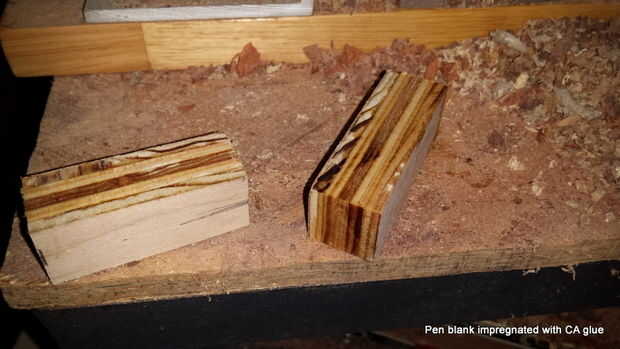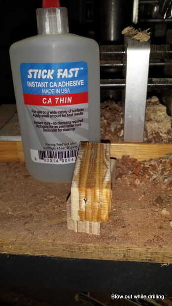Fina cola de CA tiene la consistencia del agua y mechas en la madera bastante bien. Por lo tanto, antes de perforar el segundo renglón derramé algunos en ambos lados y extremos de la el segundo espacio en blanco donde los núcleos eran visibles. La cola proporciona mayor dureza y adherencia de las fibras de madera. Ver la tercera foto de arriba. Yo era capaz de perforar la segunda pluma en blanco sin incidentes.