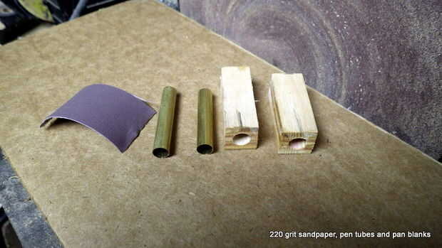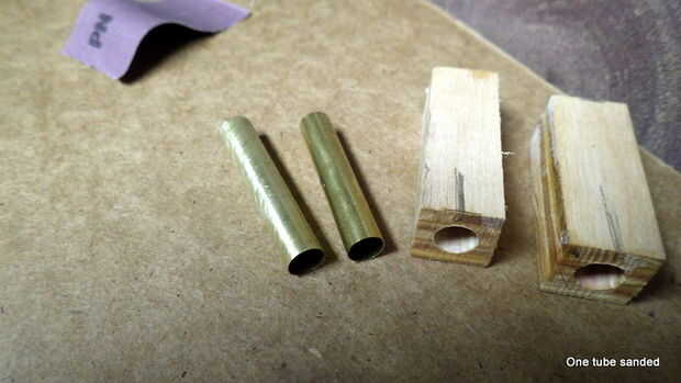 Tomar los tubos de latón de dos kit de y utilice papel de lija de grano 220 y mantener ese papel de lija y utilizarlo para todos los tubos de latón--nunca utilice para lijar madera o dejará manchas oscuras sobre la madera. Esta luz es eliminar la oxidación que se ha formado en el tubo de latón para que el pegamento se adhiere a la madera y el latón. grano 150 puede ser utilizado, sin embargo, creo que quita algunos latón y deja rayaduras más profundas.