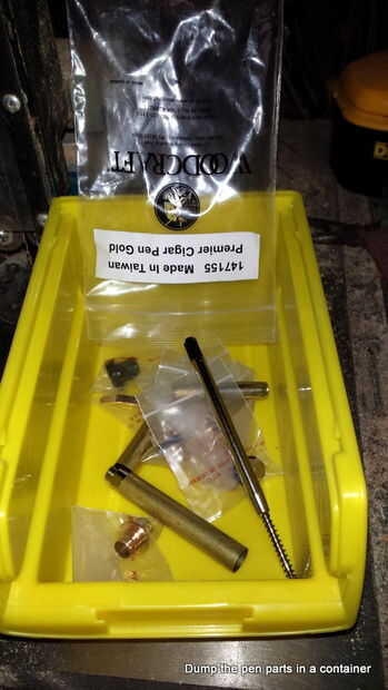 Tomar las piezas de pluma y volcar en una bañera de plástico. Esto evita que las piezas rueden fuera de la mesa y ser perdido en el aserrín en el piso de mi tienda o patadas debajo de alguna herramienta o gabinete. Cuando esto sucede, busque sólo un minuto después salir otro kit! Creo que las piezas de caída ir al mismo lugar que los desaparecidos calcetines desde el secador! jajaja mantenga la pluma de otra partes para que tenga repuestos la próxima vez le cae una parte diferente!