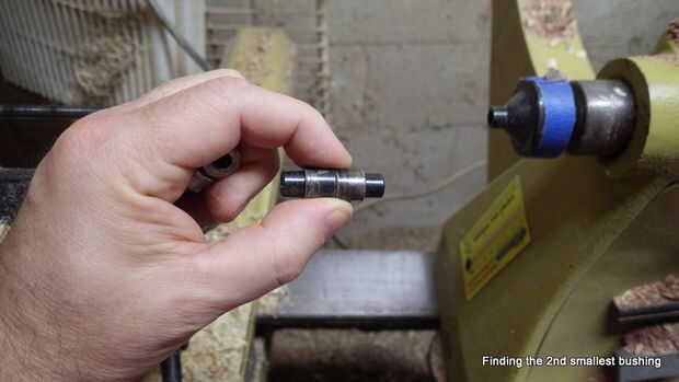 Ahora viene la parte más difícil y crítica de la puesta en marcha el proceso de colocar el correcto buje y el lápiz los espacios en blanco en el mandril en el orden correcto. Hay cuatro bujes de tamaño diferentes para la pluma de cigarros y dos longitudes de la madera. Normalmente paso los espacios en blanco de la pluma uno a la vez limitar el "descentramiento" (el mandril se tambalee más es el cabezal). Sin embargo, para este proyecto voy a hacer ambas mitades al mismo tiempo. Primero identificar los diámetros de diferencias de los bujes y colocarlos sobre una superficie plana en orden. Los dos cojinetes más pequeños están cerca de ser del mismo diámetro. Para determinar el segundo más pequeño más pequeño, me juntarlos como se muestra en la imagen terceros y usar mis dedos para determinar cuál es el segundo más pequeño diámetro. Colocar el buje de diámetro más pequeño en segundo lugar en el mandril primero, seguido por el más corto de las dos pluma los espacios en blanco (la parte superior de la pluma). El buje siguiente a colocar en el mandril es el buje mayor. El buje de segundo ahora se ha deslizado sobre el mandril y contra el buje mayor. A continuación el más madera en blanco (la parte inferior de la pluma) se ha deslizado en lugar seguido por el casquillo más pequeño. Orienté la pluma de madera dos espacios en blanco para que las líneas dibujó se basó en los espacios en blanco están cerca unos de otros. La pluma es ahora el mandril con la parte superior de la pluma a la izquierda (lado del cabezal) y la punta de la pluma a la derecha (el lado del cabezal móvil) como se muestra en la cuarta foto de arriba.